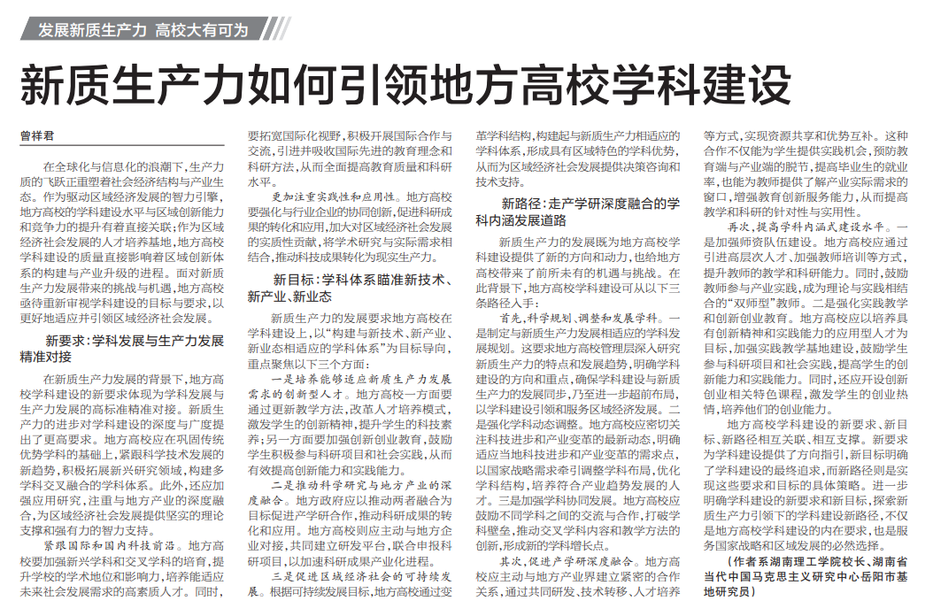 校园网讯 面对新质生产力发展带来的挑战与机遇,地方高校亟待重新审视学科建设的目标与要求,以更好地适应并引领区域经济社会发展。11月4日出版的《中国教育报》,刊发了校长曾祥君题为《新质生产力如何引领地方高校学科建设》的署名文章。文章指出,在新质生产力发展的背景下,地方高校学科建设的新要求体现为学科发展与生产力发展的高标准精准对接。地方高校应在巩固传统优势学科的基础上,紧跟科学技术发展的新趋势,积极拓...