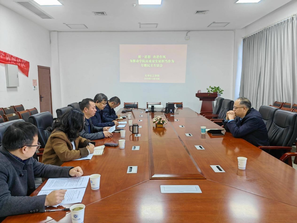 校园网讯 11月18日,化学化工学院党委在18510会议室召开了“统一思想、改进作风,为学院高质量发展担当作为”专题民主生活会。会议紧扣主题,深入查摆学院当前在思想认识、工作作风、重点工作推进等方面存在的突出问题,严肃开展批评和自我批评。学校党委委员、副校长刘长辉到会指导并作点评,学院党委领导班子全体成员参加会议。为开好本次民主生活会,学院党委高度重视,周密制定工作方案。会前,党委班子成员采取自学和集中...