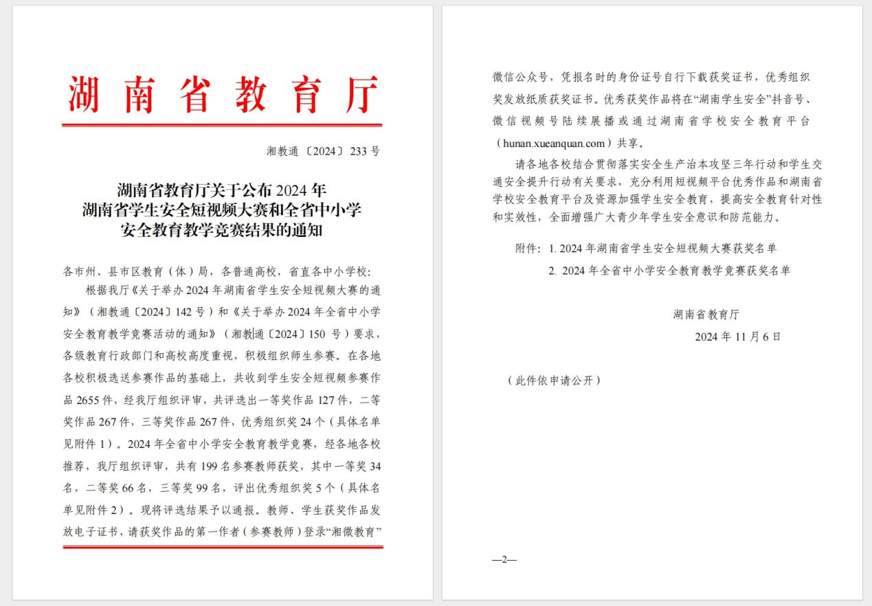 校园网讯 近日,湖南省教育厅公布2024年湖南省学生安全短视频大赛结果,我校学生作品在比赛中取得佳绩,共荣获10个奖项,其中,二等奖6项,三等奖4项。这是我校学生首次在湖南省安全短视频比赛中取得省级奖项。据悉,本次大赛由湖南省教育厅主办,活动自开展以来,我校高度重视并组织引导广大师生积极创作安全教育短视频,希望通过短视频的形式,普及学生安全教育知识,提高广大师生的安全意识和防范能力。下一步,我校将以此次...
