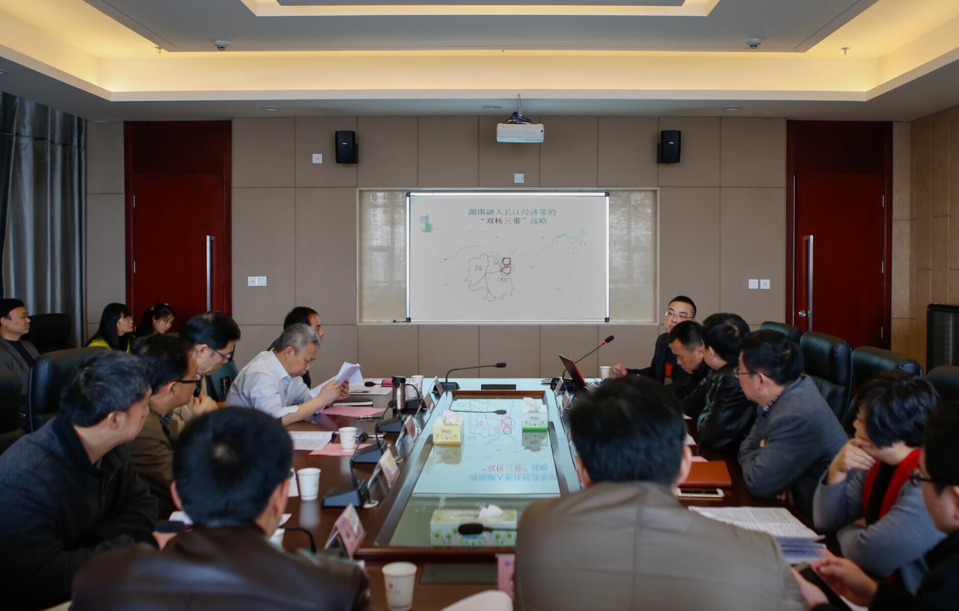 会上,邓正华博士代表项目组作课题研究汇报,他阐述了《湖南融入长江经济带重点产业布局研究》课题的研究背景和价值,同时介绍了研究内容和计划,并就研究基础、任务分工、研究进度安排和研究预期成果等作了详细说明。邓正华提出,加快湖南融入长江经济带重点产业布局,要突出建设综合交通运输体系,重点建设湘江经济带,稳步建设洞庭湖生态经济带,精心建设张吉怀生态文化旅游经济带。