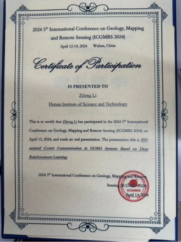 研究生李子龙在会议上作了题为《RIS-assisted Covert Communication in NOMA Systems Based on Deep Reinforcement Learning(基于深度强化学习的NOMA系统RIS辅助隐蔽通信)》的口头报告。该研究创新性地运用了深度强化学习作为研究工具,提出了不同于传统NOMA系统RIS辅助隐蔽通信的解决方案,是深度强化学习应用的一次新尝试。经过与华中师范大学、中国地质大学和成都理工大学等相关学者的激烈竞争,李子龙最终在现场专家的评选下,荣获该专题会场的优秀口头报告奖项。