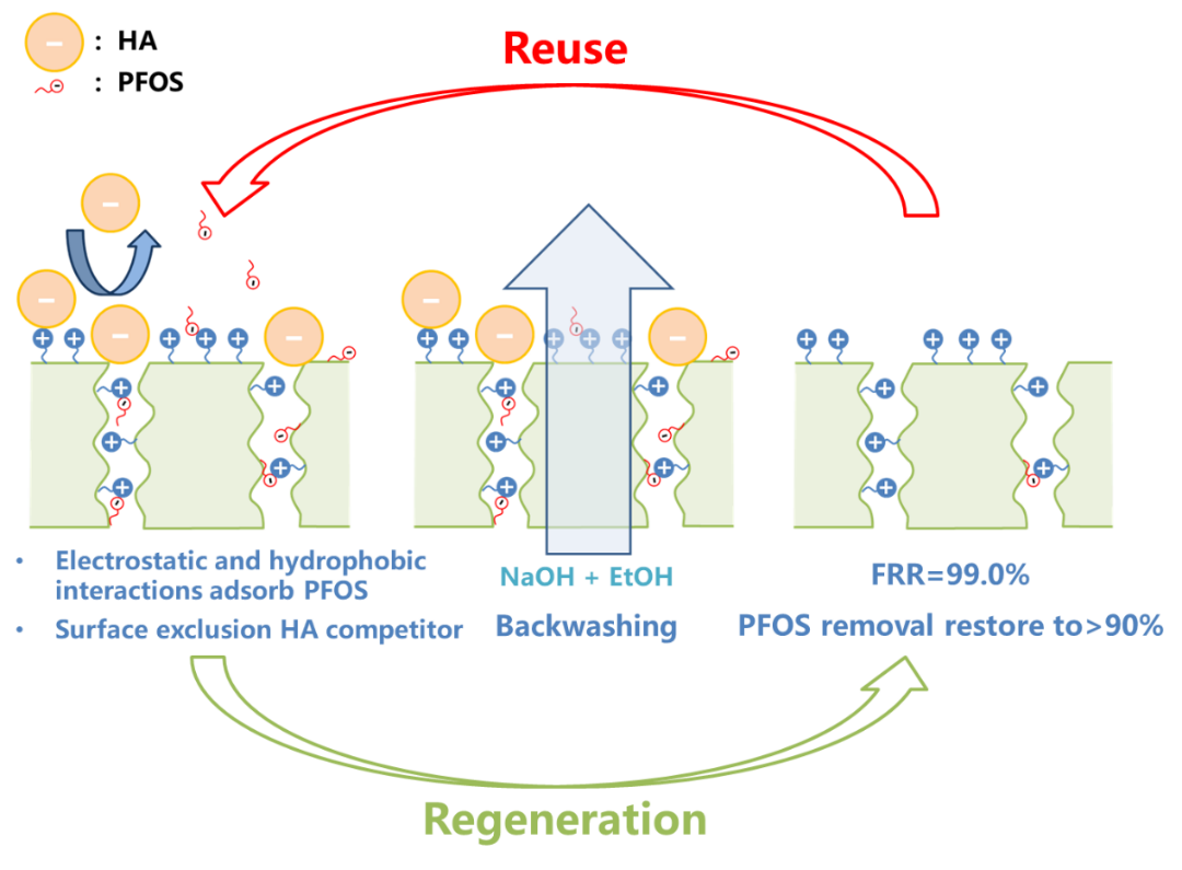 全氟烷基物质(PFAS)由于其难以降解的特性和过去几十年的滥用,已成为全球范围内水体污染的主要问题之一。膜分离作为一种低能耗、高分离效率的水处理方法,在PFAS分离方面显示出了良好的性能。然而,目前主要研究的纳滤膜存在水通量低、能量消耗高的问题,而水通量更大的超滤膜则由于孔径过大而无法有效去除PFAS。因此,针对天然水体环境中的PFAS污染问题,万弘毅课题组提出了一种结合了吸附和膜分离的吸附膜设计,通过引入吸附机制增强了对PFAS的去除能力,开发了一种亲水性的季铵化聚丙烯腈超滤膜,在中性环境下对全氟辛烷磺酸保持了超过98%的去除率。该吸附膜兼具高水通量和高PFAS去除率,成功地突破了水处理膜领域中因单一尺寸筛分机理导致难以兼顾水通量和选择性的“trade-off”效应,并通过孔径调控的方式有效地应对了实际水体中腐殖酸等各种竞争物质的干扰。该工作以“Hydrophilic membranes for effective removal of PFAS from water: anti-fouling, durability, and reusability”为题,于2024年4月9日发表在SCI一区期刊Separation and Purification Technology(DOI:10.1016/j.seppur.2024.127379)。文章第一作者是华东理工大学硕士生方傅末晗,通讯作者是徐至教授和我校万弘毅。