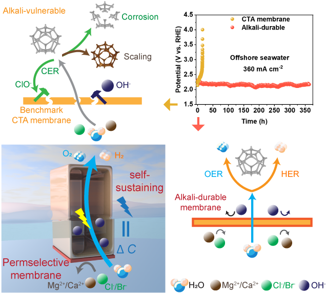 直接电解海水制氢技术的研究尚处于初级阶段,仍然面临着极大的挑战,包括由海水复杂成分引起的副反应、腐蚀和结垢。目前海水淡化技术已相对成熟,且水净化单元的运维成本也低于电解单元。为此,研究人员转向使用正渗透(FO)驱动的海水淡化为电解制氢提供净水。然而,该策略受到中性电解环境下低电流密度和贵金属催化剂高成本的限制。万弘毅通过筛选耐碱聚酰胺正渗透膜,自发从海水中选择性地提取水分子(渗透压差),为碱性海水电解自发提供净水。聚酰胺正渗透膜在长达一个月的耐碱测试中展示了卓越的水/离子选择透过性(约5830 mol mol-1),在防止电解质流失的同时(保留了超过97%的OH-),保持内部电解液与海水盐分的浓度梯度。在离岸真实海水的测试环境下,该系统维持360 mA cm-2的商业级电流密度达360小时(槽压2.10 V~2.15 V)。并且在维持了>95%的水平衡(VFO=Velectrolysis)情况下,预防了Cl/Br的腐蚀(98%截留)和Mg/Ca导致的催化剂钝化(99.6%截留)。这项研究为海水高效制氢提出了一种新思路。该工作以“Self-sustaining alkaline seawater electrolysis via forward osmosis membranes”为题,于2024年4月17日发表在SCI一区期刊Green Energy & Environment(DOI: 10.1016/j.gee.2024.04.003)。文章第一作者是华东理工大学硕士生时克,通讯作者为庄林洲教授、徐至教授和我校万弘毅。