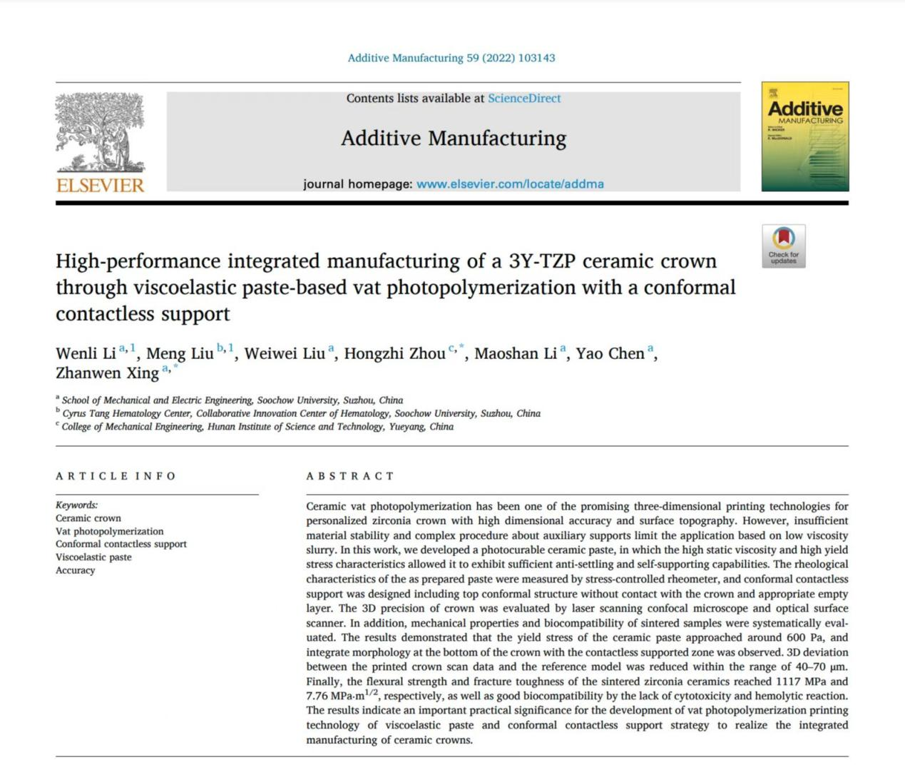 校园网讯 近日,99er6久久这里就有精品-精品国产乱码久久久人妻-国产熟妇婬乱一区二区-激情全黄做爰小说-日本无码熟妇人妻在线视频免费看机械工程学院周宏志教授在全瓷冠3D打印技术及评价方面取得新进展。研究成果以“High-performance integrated manufacturing of a 3Y-TZP ceramic crown through viscoelastic paste-based vat photopolymerization with conformal contactless support”为题发表于Additive Manufacturing杂志 (IF 11.632,SCI一区,制造工程类JCR排名第一)。