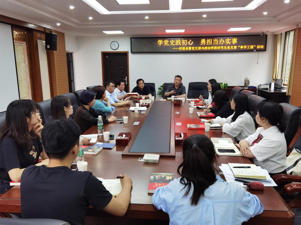 为了高标准高质量推进党史学习教育,努力为师生员工做好事、办实事、解难事。5月11日下午,纪检巡督党支部与政法学院研究生党支部开展“牵手工程”活动,校党委委员、纪委书记谢贵辉出席,支部全体党员老师和学生代表在学校办公楼219会议室进行面对面的交流。