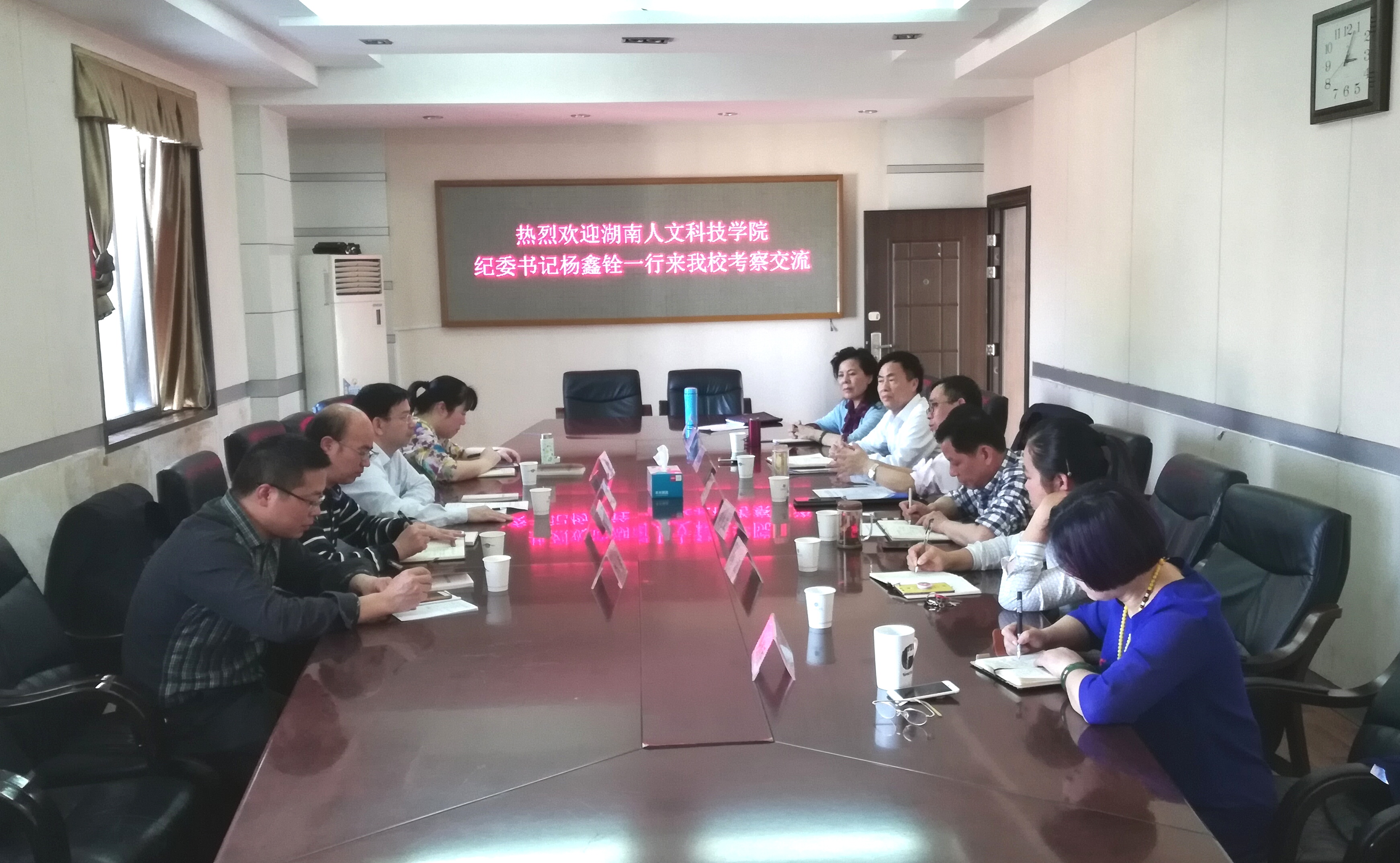 4月19日下午,湖南人文科技学院党委委员、纪委书记杨鑫铨一行来我校访问,校纪委书记谢贵辉在办公楼414会议室热情接待了客人。